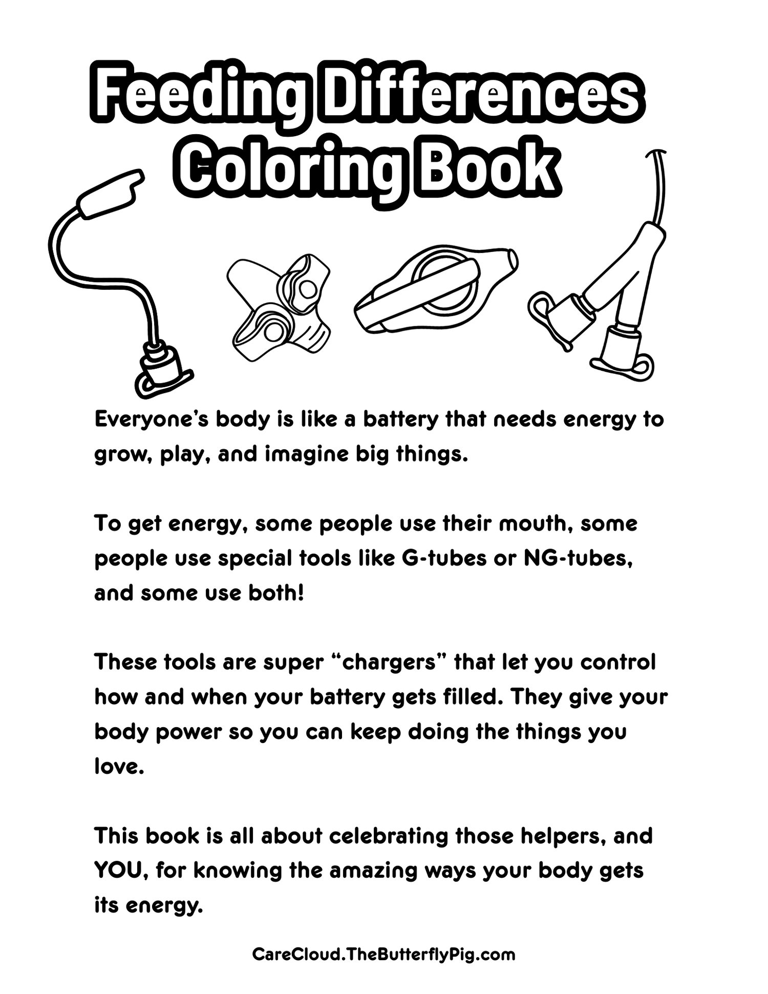 This unique coloring book introduces children to feeding differences—like G-tubes and NG-tubes—through playful, friendly illustrations. By weaving these everyday medical tools into creative fun, kids learn that bodies can have many different ways of “charging their batteries.”